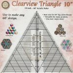 The 60 degree 10" Clearview Triangle Ruler is now equipped with easier-to-read lines and finer markings for accurate measuring. This ruler can measure and cut almost any size and is easy to handle. The extra diagonal lines help keep the 60 degree angle true. It's versatility makes is perfect for many of your quilting and crafting projects!
